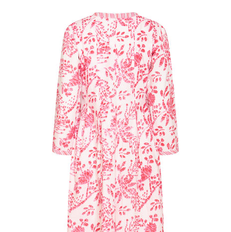 The Market Dress is block printed 100% cotton, mid length with 3/4 sleeves
